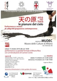 天の原AMA NO HARA (LE PIANURE DEL CIELO) Per celebrare il 150° Anniversario delle relazioni tra Giappone e Italia, l'associazione culturale shodo.it presenta una performance calligrafica del maestro Bruno Riva, membro della Japan Educational Calligraphy Federation (Nihon Kyōiku Shodō Renmei). La performance sarà accompagnata da una mostra di calligrafie giapponesi contemporanee, opere degli artisti: Kataoka Shikō (1928-2014) Yonemoto Kōro (1956-2013) Morioka Shizue, Nakajima Hiroyuki, Uehira Baikei, Yamada Tomie, Katia Bagnoli e Bruno Riva. |