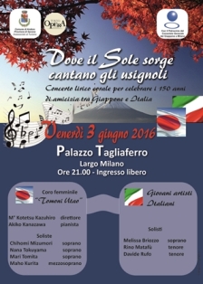CANTOINSIEME.. OLTRE LA DISTANZA .. IL PIACERE DI CANTARE! Il Coro Brianza nasce a Missaglia, nella Brianza Orientale, nell'ottobre del 1968. Dall'originale cliché dei cori Alpini maschili, il Coro, con l'inserimento di nuove voci, si è spinto verso nuovi generi musicali tra cui ad esempio il gospel, i canti della tradizione popolare e di cantautori moderni. Con questo bagaglio musicale il Coro Brianza ha esteso la sua presenza al di là del territorio lombardo raggiungendo le platee di varie regioni italiane fino a varcare i confini nazionali con esperienze in Francia, Germania, Rep. Ceca, Spagna e Svizzera.... E perchè proprio nell'occasione del 2016, anno in cui ricorre il 150° anniversario delle relazioni tra Giappone ed Italia, non contattare un coro proveniente da un paese ancora più lontano? L’invito viene rivolto al Noda Chorus di Tokyo, che nasce a NODA, città a nord-est di Tokyo nella Prefettura di Chiba, nel giugno del 2009. Grazie alla comune passione dei coristi per il canto, in particolare modo per l’opera lirica, dopo due anni di intenso lavoro il coro giapponese inizia ad esibirsi in concerto fino ad approdare a maggio di quest'anno nel Nord Italia, per il piacere di cantare, oltre alla distanza, insieme al Coro Brianza e al Coro Fior di Montagna. |