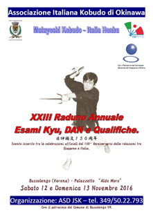 XXIII SEMINARIO ANNUALE DI MATAYOSHI KOBUDO XXIII seminario annuale di Matayoshi Kobudo, organizzato ad opera dell'Associazione AIKO, che da 23 anni consecutivi l’AIKO è impegnata nell'organizzazione a Verona di un raduno nazionale dedicato alla diffusione del Kobudo di Okinawa secondo lo stile insegnato dal Maestro Shinpo Matayoshi, al quale partecipano atleti provenienti da tutta Italia, in particolare dal Veneto, dalla Lombardia, dall’Emilia Romagna, dalla Toscana, dal Lazio, dalla Puglia, dalla Campania e dal Friuli Venezia Giulia. Direttore tecnico della manifestazione è il Maestro Andrea Guarelli, cintura VIII Dan di Karate e di Kobudo, autore tra l’altro di ben quattro pubblicazioni di carattere scientifico sulle arti marziali. il Kobudo era un'arte alquanto frammentaria, almeno fino all'inizio del Novecento.Vi erano infatti dei maestri esperti nell'uso di una o due armi al massimo e di relativi uno o due Kata. Senza l'aiuto, la passione e l'opera di raccolta del maestro Shinko Matayoshi gran parte delle antiche tecniche del Kobudo sarebbero andate perdute. Il Kobudo è un’arte ancora poco conosciuta che in Italia si è diffusa grazie all’attività dell’ Associazione AIKO. |