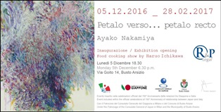 PETALO VERSO …PETALO RECTO R&P Legal presso i suoi uffici di Busto Arsizio ospiterà un evento culturale-artistico che vedrà la partecipazione contemporanea della famosa pittrice astrattista dell’Accademia di Belle Arti di Brera Ayako Nakamiya e del Maestro Chef stellato Haruo Ichikawa del ristorante Iyo di Milano, primo ristorante giapponese insignito del prestigioso riconoscimento dalla Guida Michelin in Italia; mentre Nakamiya sarà presente con un’esibizione delle sue opere, dipinti a olio su tela e acquerelli su carta di diverse dimensioni, caratterizzata da una ricerca sul colore che l’artista tende a far vibrare verso il bianco, Ichikawa intratterrà gli ospiti con un Food cooking show legato alla tradizione culinaria giapponese. Ad introduzione dell'evento si terrà una conferenza a cura della gallerista Monica Masiero e dell'esperta giapponese di storia dell'arte Rino Utagawa L’evento è inserito nelle celebrazioni ufficiali del 150° Anniversario delle relazioni tra Giappone e Italia. |