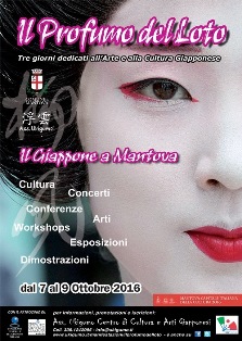 IL PROFUMO DEL LOTO - IL GIAPPONE A MANTOVA La Manifestazione di cultura giapponese, organizzata dall'Associazione culturale Ukigumo con cadenza annuale per accogliere ogni volta l'autunno all'insegna della cultura giapponese nella città di Mantova, Capitale Italiana della Cultura 2016, e cornice ideale per un incontro tra culture, offre anche quest'anno un programma ricco di appuntamenti con il Giappone tra cui l'Esposizione di Ikebana di scuola Sogetsu, l'introduzione alla lingua giapponese, la lezione di cucina giapponese "impariamo a fare il sushi" , i trattamenti di Shiatsu a cura scuola Centro Studi Shiatsu Nagaiki - Lezione di Makko_ho e Do-In, automassaggio e ginnastica energetica, dimostrazione di chadō e shodō, conferenze di cultura giapponese, esposizione di Ikebana e Mostra di Pittura Contemporanea "il Viaggio- Tabi" di Hikari Miyata, e tanti altri appuntamenti. |