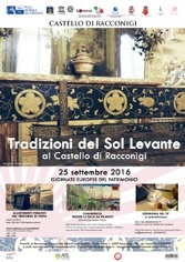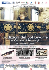 TRADIZIONI DEL SOL LEVANTE - AL CASTELLO DI RACCONIGI L’evento è organizzato dal Complesso Monumentale del Castello e Parco di Racconigi, afferente il Polo Museale del Piemonte e si inserisce nell'ambito degli appuntamenti in programma per le GIORNATE EUROPEE DEL PATRIMONIO , nell'alveo delle quali si terrà la ricorrenza dell'anniversario dei 150 anni delle relazioni tra Italia e Giappone. Le giornate del fine settimana del 24 e 25 sono dedicate alla presentazione della cultura giapponese attraverso diversi e sfaccettati momenti culturali tra i quali si annoverano un' esposizione di oggetti tradizionali giapponesi appartenenti alla collezione del Castello di Racconigi; visite tematiche - laboratorio di calligrafia- degustazione di piatti giapponesi - cerimonia del tè a cura dell’associazione Sakura; performance di arti marziali (kendo; jodo; iaido) a cura delle Associazioni Shubukan e Shisei, conferenza sul Rinascimento giapponese, e sulle prime esperienze italiane in Giappone. |