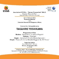 CONCERTO STRAORFINARIO DI TAKAHIRO YOSHIKAWA Ritorna a Brescia per un concerto straordinario il Maestro Takahiro Yoshikawa, inserito recentemente dalla più prestigiosa rivista musicale nipponica tra i 10 pianisti giapponesi più importanti nel panorama internazionale. Ritorna per l'affetto che lo lega all'Associazione Sfera Franceschetti Onlus, da alcuni anni impegnata in un progetto di assistenza e formazione dedicata in particolare alle mamme e ai bambini nella Repubblica Democratica del Congo. Il programma del Maestro prevede l'esecuzione di brani di Brahms, Debussy, Chopin, e, in ricordo delle vittime del recente terremoto, il brano Litany 1 di Tōru Takemitsu. |