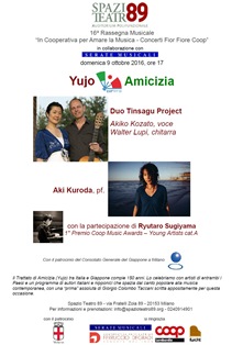 YUJO/ AMICIZIA Il concerto celebra il 150° anniversario del Trattato di Amicizia tra Italia e Giappone con musiche e interpreti di entrambi i Paesi: il Duo Tinsagu Project, formato dalla voce di Akiko Kozato e dalla chitarra di Walter Lupi, proporrà una scelta dei più celebri canti popolari italiani e nipponici, rivisitati dai loro arrangiamenti “cross-over” fra tradizione, modernità e avanguardia. La pianista Aki Kuroda, sola e a quattro mani con il figlio “enfant prodige” Sugiyama Ryutaro (già vincitore di numerosi premi in concorsi musicali per l’infanzia) eseguirà brani classici e contemporanei di Autori italiani e giapponesi. In programma anche una “prima” assoluta di Giorgio Colombo Taccani, scritta appositamente per questo evento. |
