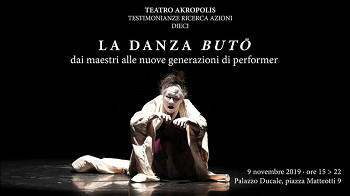 LA DANZA BUTŌ La danza butō rappresenta oggi uno dei confini piu estremi del lavoro sul corpo e sull'azione fisica e una della espressioni più radicali di rappresentazione. La genesi di questa forma d'arte, che dal Giappone degli anni Cinquanta ha ispirato artisti di tutto il mondo, ha contaminato le piu diverse forme di creazione per la scena, dalla danza al teatro, dalla performance al circo contemporaneo. L'evento prevede tre interventi performativi, una mostra fotografica e un incontro di riflessione, a cui parteciperanno artisti e studiosi che negli ultimi anni hanno dedicato al butō le loro ricerche. Per la composizione della giornata e la scelta degli artisti la direzione artistica di Teatro Akropolis si avvale della collaborazione di Samantha Marenzi e Alessandra Cristiani, entrambe fondatrici della storica rassegna romana sulla danza butō Trasformazioni. |