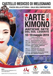 ●Castello Mediceo di Melegnano - Piazza della Vittoria - Sala dell'Imperatore ○venerdì 10 Maggio – ore 17,30 - Inaugurazione della mostra (con l’esecuzione di alcuni brani tratti dalla“Madama Butterfly di Puccini. con Soprano: Monica Mariani, al Pianoforte: Gian Francesco Amoroso) - Ingresso gratuito - Orari mostra: martedì / venerdì 16:00 - 19:00 sabatao/domenica : 10:00- 12:00 /16:00- 19:00 LUNEDì CHIUSO ○sabato 11 Maggio – ore 20,45 - Spettacolo “Caleidoscopio nipponico” (Un viaggio musicale al pianoforte con brani di autori contemporanei giapponesi, accompagnato da immagini scattate da alcuni fotoamatori e dalla lettura di brevi brani letterari antichi e moderni - con Susanna Marino - testi e immagini e Luca Rampini - pianoforte, Sala delle Battaglie) ○venerdì 17 Maggio – ore 20,45 - Presentazione “Cosa è il Kimono?" (accompagnata dalla proiezione di numerose immagini ed illustrazioni sul tema. A cura di Bruno Gentili - testi e immagini, Sala delle Battaglie). ○sabato 18 Maggio – ore 17,30 – Presentazione del “Kitsuke" vestizione del kimono (con un'introduzione socio-antropologica sull'arte vestimentaria nipponica a cura di Susanna Marino, a cui farà seguito la vestizione del kimono: kitsuke. La maestra Tomoko Hoashi, illustrerà, passo dopo passo, come indossare questo antico capo d'abbigliamento tradizionale). |