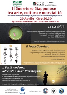 Il Guerriero Giapponese tra arte, cultura e marzialità L’Associazione kokoro di Bergamo, in collaborazione con il settore Arti Marziali dell’UISP organizza un incontro articolato in tre eventi in cui approfondire la figura del Samurai attraverso tre momenti : una Cerimonia del te, a cura della Maestra Junko Nishimori (associazione Kokoro), una Dimostrazione di Arti Marziali Giapponesi, a cura di Mu-Nami asd e infine un' intervista a Keiko Wakabayashi donna, artista e guerriera, che tramite il racconto della sua vita mostrerà l'unicità del guerriero Nipponico. |
