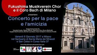 CONCERTO PER LA PACE E L'AMICIZIA Il concerto per la pace e l’amicizia è organizzato dal Fukushima Musikverein Chor, in occasione della sua tournée europea, in collaborazione con il Coro Bach di Milano. Il Coro Fukushima è stato fondato nel 1990 da Korai Masanobu, per il desiderio di creare un coro capace di tenere esecuzioni di alto livello in Giappone e all’estero. Dalla fondazione il Coro ha organizzato concerti in Giappone e a Vienna, Berlino, Lipzig Seoul, Bratislava, Chemnitz. Il coro è riconosciuto nell’ambiente per i molti concerti con la Fukushima Musikverein Orchestra. Nel loro vasto repertorio è presente la musica sacra, la musica occidentale fino alla contemporanea, e anche i compositori giapponesi tradizionali e contemporanei. Il programma prevede musiche di Yamada Kosaku, Takata Saburo, Takemitsu Toru (Fukushima Musikverein Chor) musiche di Bruno Bettinelli, Serghei Rachmaninov, Morten Lauridsen(Coro Bach di Milano) e Messa no.2 D167 G maggiore di Schubert, Magnificat RV610 di Vivaldi (Fukushima Musikverein Chor e Coro Bach di Milano). |