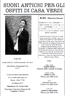 SUONI ANTICHI PER GLI OSPITI DI CASA VERDI L’Associazione Fucina Italia organizza il concerto del celebre oboista giapponese Katsuya Watanabe nella prestigiosa casa di riposo per musicisti Giuseppe Verdi. Il musicista sarà accompagnato nelle sue performances da Klaidi Sahatci, Primo violino dell' Orchestra della Tonhalle di Zurigo e da tre musicisti della Filarmonica della Scala: Stefano Lo Re (Secondo violino), Simonide Braconi (Viola) e Sandro Laffranchini (Violoncello). In programma sono previsti brani di Bernhard Henrik Crusell:Divertimento C-Dur Op.9 Anton Reicha; Oboenquintett F-Dur Op.107. Katsuya Watanabe si è laureato in musica l’Università delle Arti di Tokyo. Dopo aver vinto il primo premio ed il gran premio al Japan Wind and Percussion Competition nel 1990 ha iniziato una brillante carriera come primo oboe in orchestre sinfoniche prestigiose quali la Sinfonieorchester Wuppertal, e orchestre di teatri d’opera quali lo Staatstheater Karlsruhe e Deutsch Oper Berlin; è primo oboe dei Solistes Europee Luxembourg. Docente di prestigiose masterclass, è professore ospite del Senzoku Gakuen College of Music. |