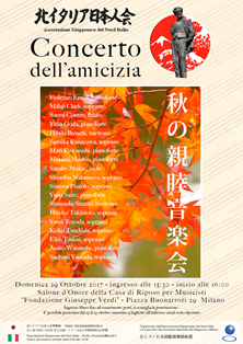 CONCERTO DELL'AMICIZIA Concerto di Gala dell’Associazione Giapponesi residenti nel Nord Italia: musicisti e cantanti giapponesi che risiedono in Italia e che sono membri dell’Associazione. “Il concerto dell’amicizia” si è tenuto per la prima volta nel 1996 presso il Teatro d’Arco, e, grazie al supporto di tutti i membri dell’Associazione, dei musicisti e di tante altre persone è stato confermato di anno in anno fino ad arrivare ai giorni nostri. Anche quest’anno l’evento vanta una cospicua presenza di artisti giapponesi, che si esibiranno per le due categorie di canto e musica strumentale. |