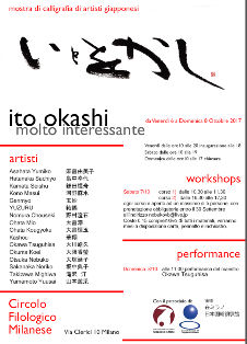ITO OKASHI / mostra di calligrafia di artisti giapponesi Si svolgerà a Milano “Ito okashi (molto interessante)”, mostra calligrafica di artisti giapponesi. Di seguito gli artisti partecipanti:Asahata Yumiko 麻畠由美子 Hatanaka Sachiyo 畠中幸代 Kamata Seishu 鎌田惺舟 Kono Masui 河野麻水 Genmyo 玄妙 YUZURU 結鶴 Nomura Chouseki 野村澄石 Ohata Mio 大畠澪 Ohata Kougyoku 大畠恒玉 Kashou 華翔 Okawa Tsuguhisa 大川皓久 Okuma Koei 大隈香瑩 Otsuka Nobuko 大塚延子 Sakanaka Noriko 坂中典子 Takizawa Mighiwa 滝沢 汀 Yamamoto Yuusai 山本遊采 |