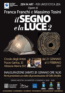 IL SEGNO E LA LUCE2 l'Associazione Zen in Art presenta le opere degli artisti Franca Franchi ,scultrice del vetro e del cristallo, e Massimo Tosini (pittore) fondatori delmovimento “Zen in Art – Per un’Estetica Zen” Gli artisti si ispirano al pensiero e all’estetica Zen in chiave contemporanea ed in particolare al pensiero del filosofo e maestro Zen giapponese Shinichi Hisamatsu; nel loro percorso crearivo sono seguiti dal grande critico Gillo Dorfles, autore di numerosi scritti sull’estetica Zen.Durante l’inaugurazione verrà proiettato un video in cui sarà proprio il critico Gillo Dorfles a presentare gli artisti e le loro opere. |