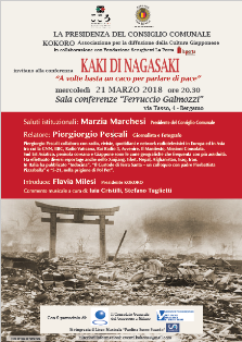 Conferenza "KAKI DI NAGASAKI" (relatore Piergiorgio Pescali Giornalista e fotografo) c/o Sala Conferenze “F. Galmozzi” - Via Tasso, 4 Cerimonia di Piantumazione del KAKI c/o Scuola Elementare "Scuri" - Via Dei Galliari, 1 |