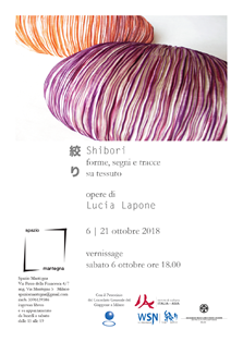 Via Piero della Francesca 4/7, ang. Via Mantegna 5, Milano 6 ottobre ore 18: Vernissage 13 ottobre ore 18/20: incontro “Arimatsu Narumi Shibori”, un racconto a cura di Lucia Lapone 20 e 21 ottobre: Laboratorio di Shibori - tecniche base mob. 3396139586 ingresso libero e su appuntamento da lunedì a sabato dalle 15 alle 19 |