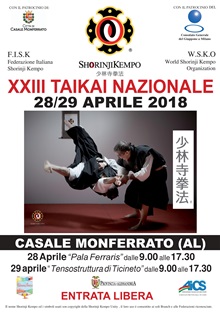 XXIII TAIKAI NAZIONALE DI SHORINJI KEMPO Durante la cerimonia delle premiazioni dell’Embukai, sarà riservato un momento molto importante alla presentazione di una Associazione benefica locale che spiegherà l’attività che svolge, ed alla quale verrà destinata la raccolta fondi che si svolgerà durante tutti i 3 giorni dell’avvenimento mediante posizionamento di un apposito contenitore. La manifestazione procederà col Seminario tecnico condotto dal Sensei Hiroshi Aosaka 9° Dan coadiuvato da tutti gli altri insegnanti presenti, italiani e stranieri. Il sabato sera è prevista cena insieme presso l’Ariotto Village di Terruggia. Domenica 29 Aprile si proseguirà con un seminario tecnico riservato agli insegnanti e non aperto al pubblico. L’evento è patrocinato dal Comune di Casale Monferrato e dalla Provincia di Alessandria. |