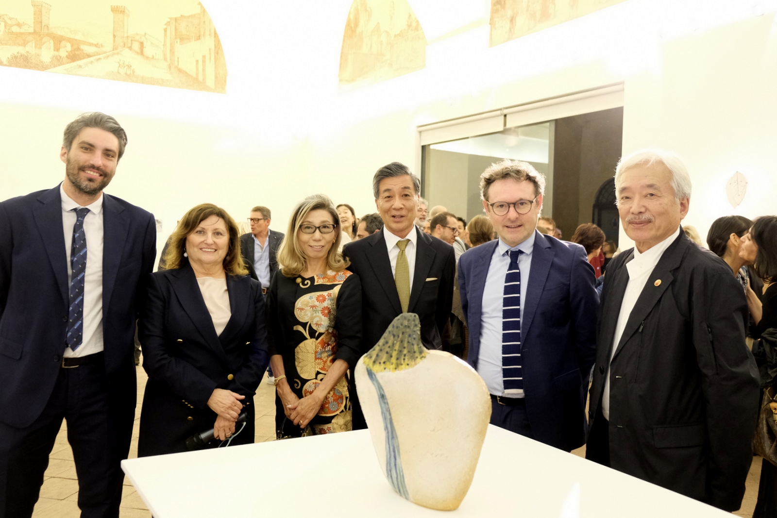 式典終了後、雨宮総領事と平井氏は、イーゾラ市長、清水文化会館館長、ベネデッティ・ファエンツァ市姉妹都市協会会長、デル=ベーネ・ラヴェンナ日本友好協会会長らとともに、「日本の足跡展」の開幕式に参加しました。同展は、今年で20周年を迎える「十月日本祭」(ラヴェンナ日本友好協会主催)の事業の一つであり、平井氏を始めとするファエンツァと縁のある日本人作家14名の作品が展示されています。