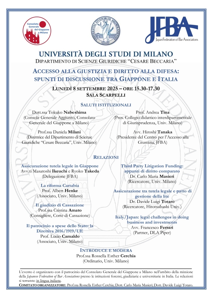 Nel pomeriggio dell'8 settembre, il Dipartimento di Scienze Giuridiche dell'Università degli Studi di Milano, ha ospitato un simposio dal titolo “Accesso alla giustizia e diritto alla difesa: spunti di discussione tra Giappone e Italia”, al quale è stata invitata una delegazione della Japanese Federation of Bar Associations (tra cui l'avvocato Hiroshi Tanaka) in visita in Italia. I discorsi istituzionali da parte dell’Università degli Studi di Milano hanno visto gli interventi del Prof. Andrea Tina e della Prof.ssa Daniela Milani.