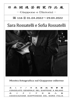 La mostra rimarrà in programmazione fino al 29 aprile, e si potrà visitare da lunedì a venerdì, (esclusi i giorni festivi del 18 e 25 aprile), previo appuntamento, confermando il giorno e l’orario della visita a questo indirizzo: culture@ml.mofa.go.jp 在ミラノ総領事館が北イタリア日本人会と共催で行っている『日本関連芸術家作品展 – Giappone e Dintorni』の一環として、Sofia Rossatelli & Sara Rossatelliによる写真展を総領事館の受付ホールに展示していますので、来館時にご覧ください。※