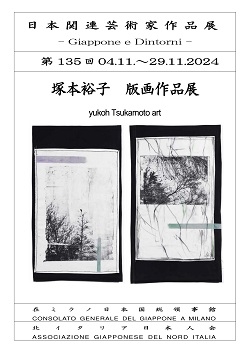 La mostra rimarrà in programmazione fino al 29 novembre, e si potrà visitare da lunedì a venerdì nell’orario di apertura del Consolato (9.15-12.15 /13.30 – 16.30). 在ミラノ総領事館が北イタリア日本人会と共催で行っている『日本関連芸術家作品展 – Giappone e Dintorni』の一環として、塚本裕子氏の作品(主にオリジナルモノタイプ版画*)を総領事館の受付ホールに展示しています。出展者の、塚本裕子氏は自分のアート・人生観を以下の通り説明します。