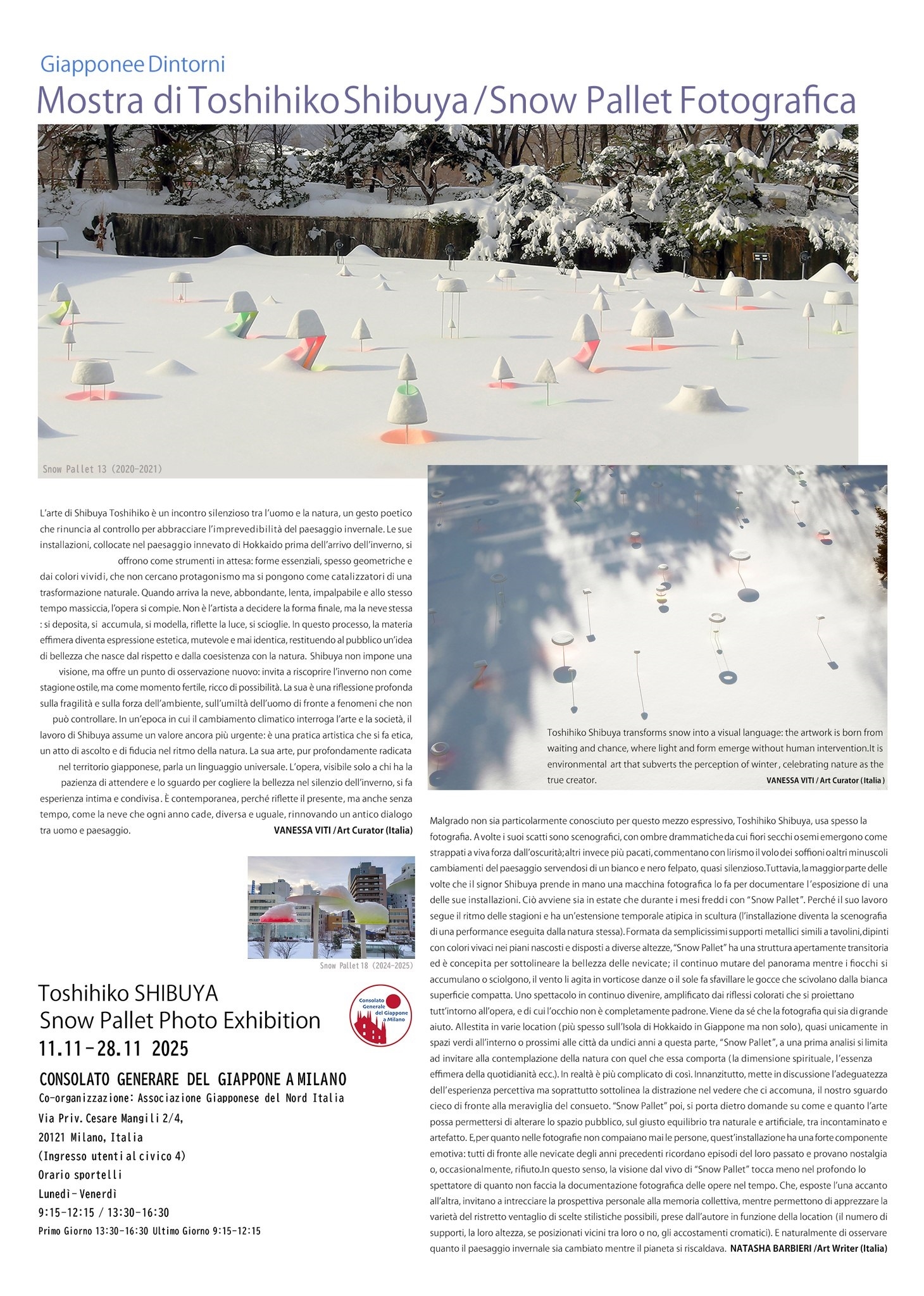 「スノーパレット」とは札幌在住の環境芸術家、澁谷俊彦による冬の野外アートです。「スノーパレット」は2011年から2025年まで18回連続、主に北海道札幌、そして小樽、千歳、帯広など毎回開催場所を変えながら、毎冬設置されてきました。札幌は年間降雪量6mにもなる人口196万の大都市です。「スノーパレット」とは、雪の上に立つオブジェの表面または底面に蛍光塗料を塗ったアート作品です。そうすることで、雪が降り積もると、鮮やかな色が雪面に映ります。オブジェ設置後は人の手は一切加えることはありません。人為的造作をしないことに美意識を見出す日本の伝統的な世界観を表現していると、海外メディアでは特に評価されております。時間帯や積雪量太陽の光量、オブジェの数や高さによって風景が変化する作品です。年々降雪量は減少傾向にあり、近年は短期間で大雪から急激な気温上昇を繰り返す異常気象の兆しが見えます。環境問題は人類にとって最大の課題です。近年、ヨーロッパの多くの地域で冬の降雪量は激減しております。ウインタースポーツの開催にも雪不足のため、人工雪が多く使われている現状です。 そうした現状から、冬のアートプロジェクト「スノーパレット」は大変注目されております。 2026年イタリア、ミラノ、コルティナダンペッツォ冬季オリンピック、パラリンピックに合わせて、この展覧会はミラノ及び北イタリアと札幌、北海道の文化交流促進のために開催されるものです。